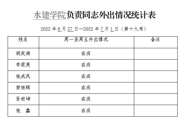 » best365网页版登录官网负责同志外出情况统计表(第十九周)