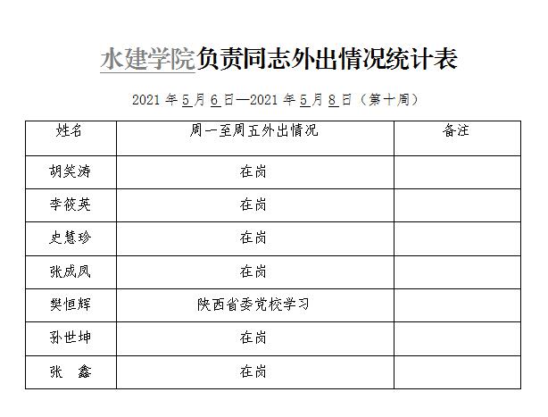 » best365网页版登录官网负责同志外出情况统计表(第十周)