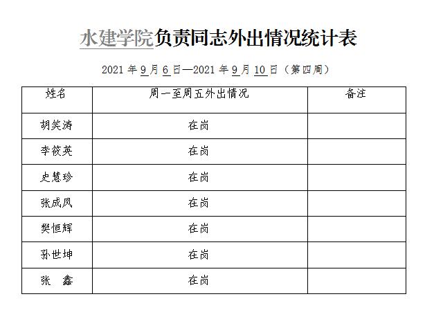 » best365网页版登录官网负责同志外出情况统计表(第四周)