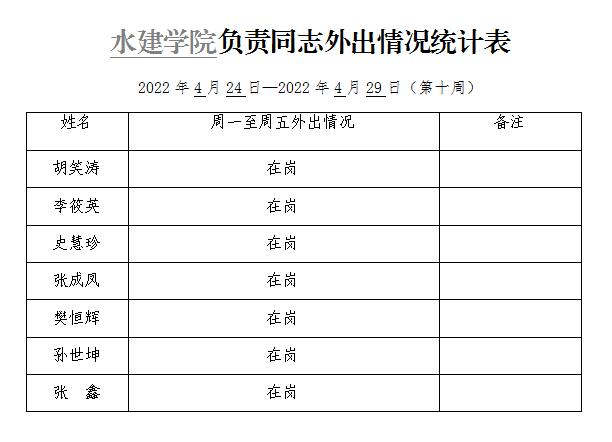 » best365网页版登录官网负责同志外出情况统计表(第十周)