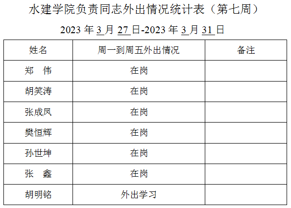 » best365网页版登录官网负责同志外出情况统计表(第七周)