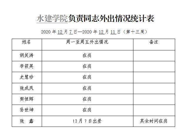 » best365网页版登录官网负责同志外出情况统计表(第十三周)