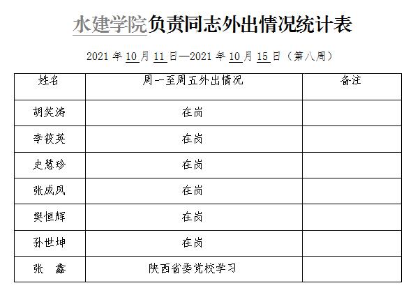 » best365网页版登录官网负责同志外出情况统计表(第八周)