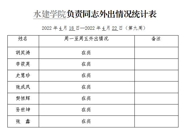 » best365网页版登录官网负责同志外出情况统计表(第九周)