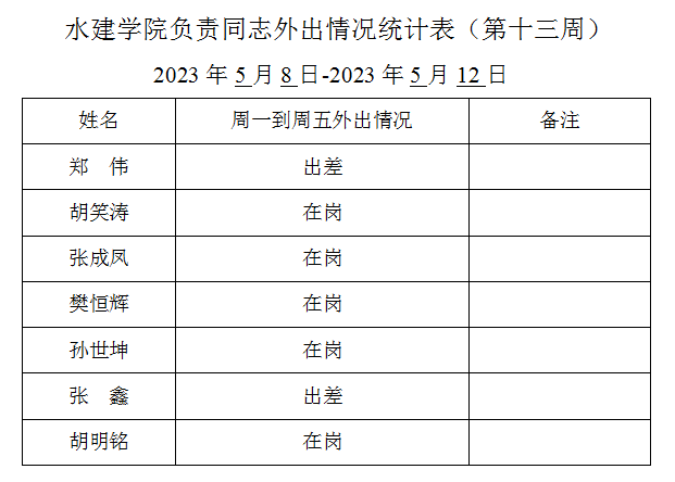 » best365网页版登录官网负责同志外出情况统计表(第十三周)