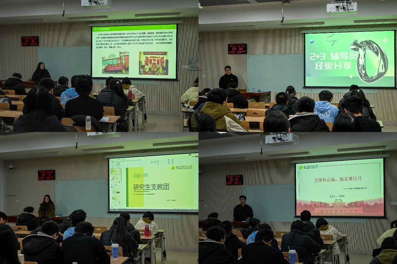 为帮助学生深入了解推免政策、找准发展规划,2月27日晚,由西农创新者联盟与青马社农学分社联合举办的"保研之路,启航未来"经验分享会在北校区N8212教室圆满举行。本次活动特邀通过"2+3辅导员计划"与"研究生支教团"项目成功推免的王莹、阿卜杜、郭培涵和马原泽4位优秀学生担任主讲,吸引了近百名学生参与。